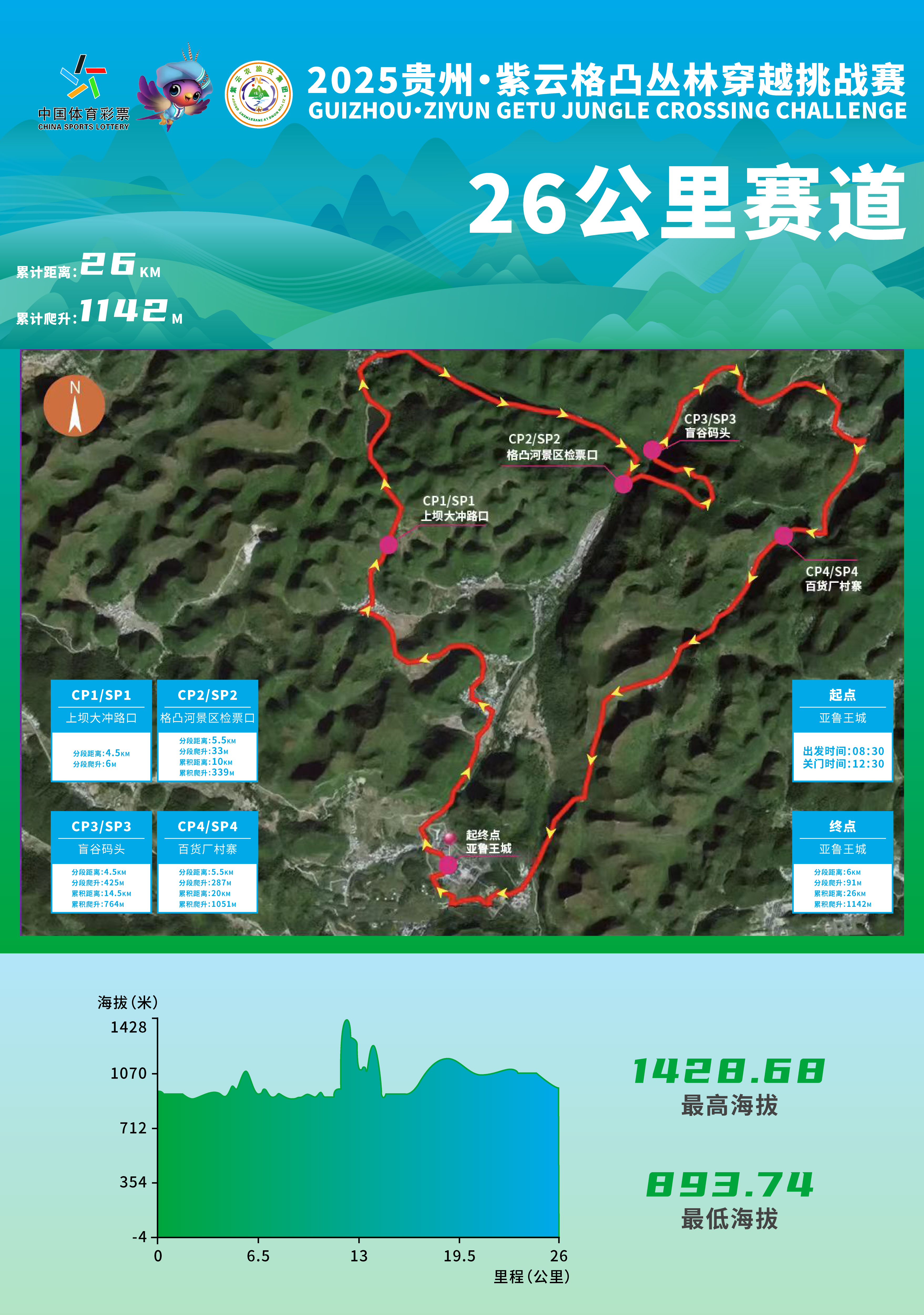 1.挑战组(26KM)线路:亚鲁王城(起终点)-攀岩小镇-上格井-上坝一上坝大冲路口-变色湖-大河苗寨-夹山一线天一格凸河沿河步道-大穿洞码头-格凸河景区检票口-鹰燕阁-蜘蛛人观景台-燕子洞-女神足印-通天洞-方竹林-回音谷-穿上洞-穿上洞观景平台-祈福洞-盲谷码头-水淹坝-水淹坝村庄-水井湾村寨-冗里村寨-竹林寨-百货厂村寨-新寨-小寨-毛龚村寨-亚鲁王城。