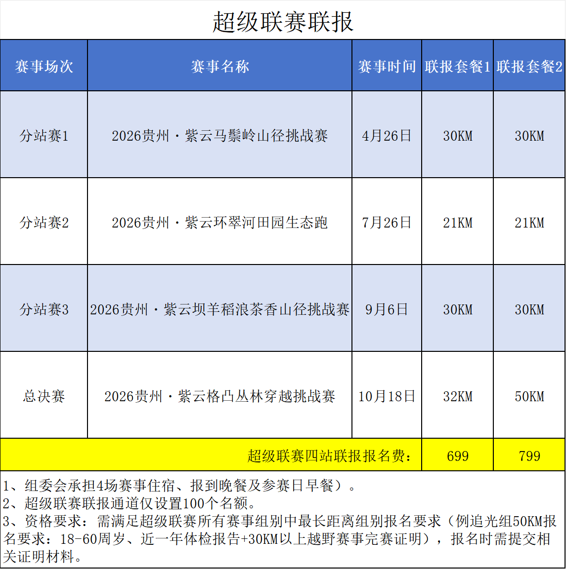 为鼓励精英选手全程参与,特设置超级联赛联报通道,报名选手需参加全部3场分站赛(最长距离组)+1场总决赛(30KM距离组),联报费用为699元/人,3场分站赛(最长距离组)+1场总决赛(50KM距离组),联报费用为799元/人,(组委会承担4场赛事住宿、报到晚餐及参赛日早餐)。超级联赛联报通道仅设置100个名额。