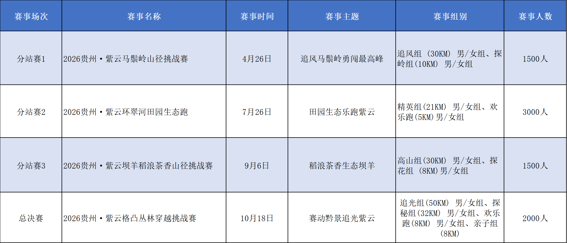 分站赛2:2026贵州·紫云环翠河田园生态跑:设21KM精英组(18-60周岁)、5KM欢乐跑(65周岁以下)。